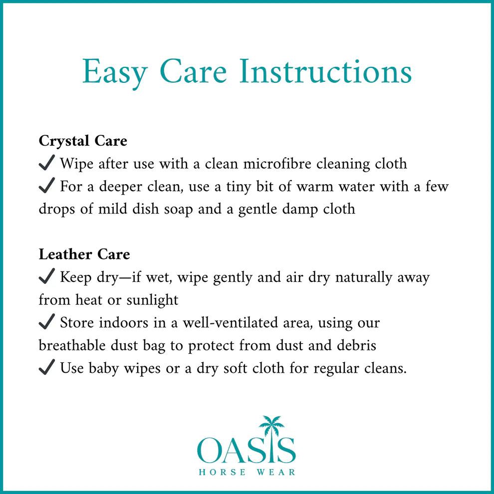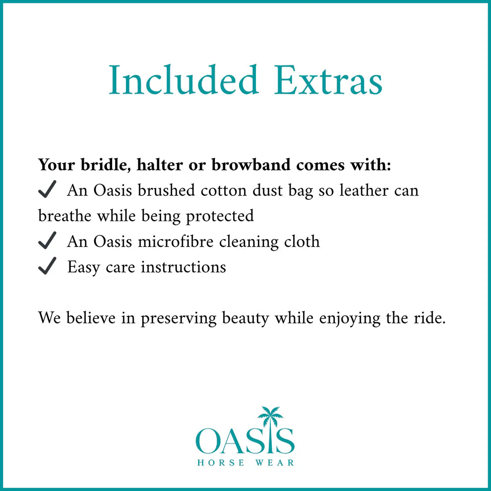 At Oasis Horse Wear, we take pride in carefully selecting the finest materials. This bridle is handcrafted featuring premium soft leather ensuring exceptional softness, flexibility, and durability, while allowing each piece to develop its own unique character over time.