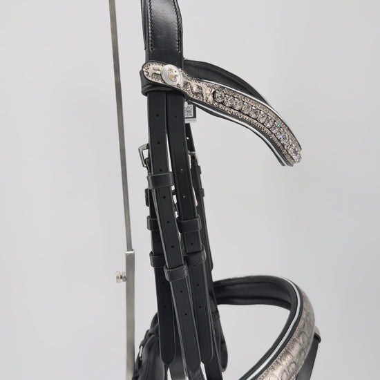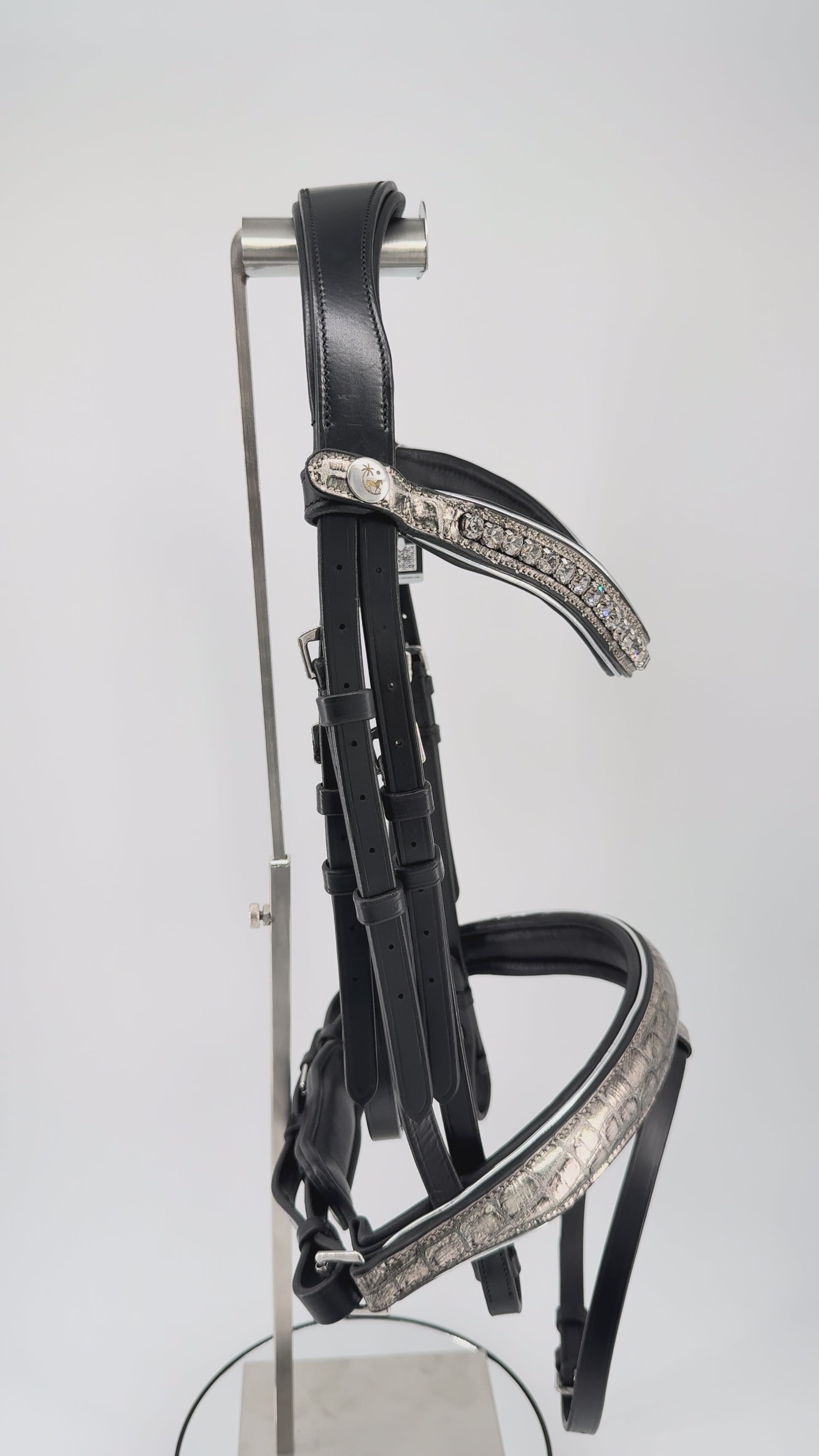 Feel the adventure with our limited edition FRESHY CROC Bridle! Crafted with artisan Italian leather in plantium croc, paired with soft black leather and accented with luxurious silver detailing and sparkling crystal velvet Preciosa European crystals, comparable to Swarovski. Bridle features silver piping on the noseband and browband, stainless steel silver hardware and large European Preciosa crystal velvet crystals to add a touch of brilliance and refinement.