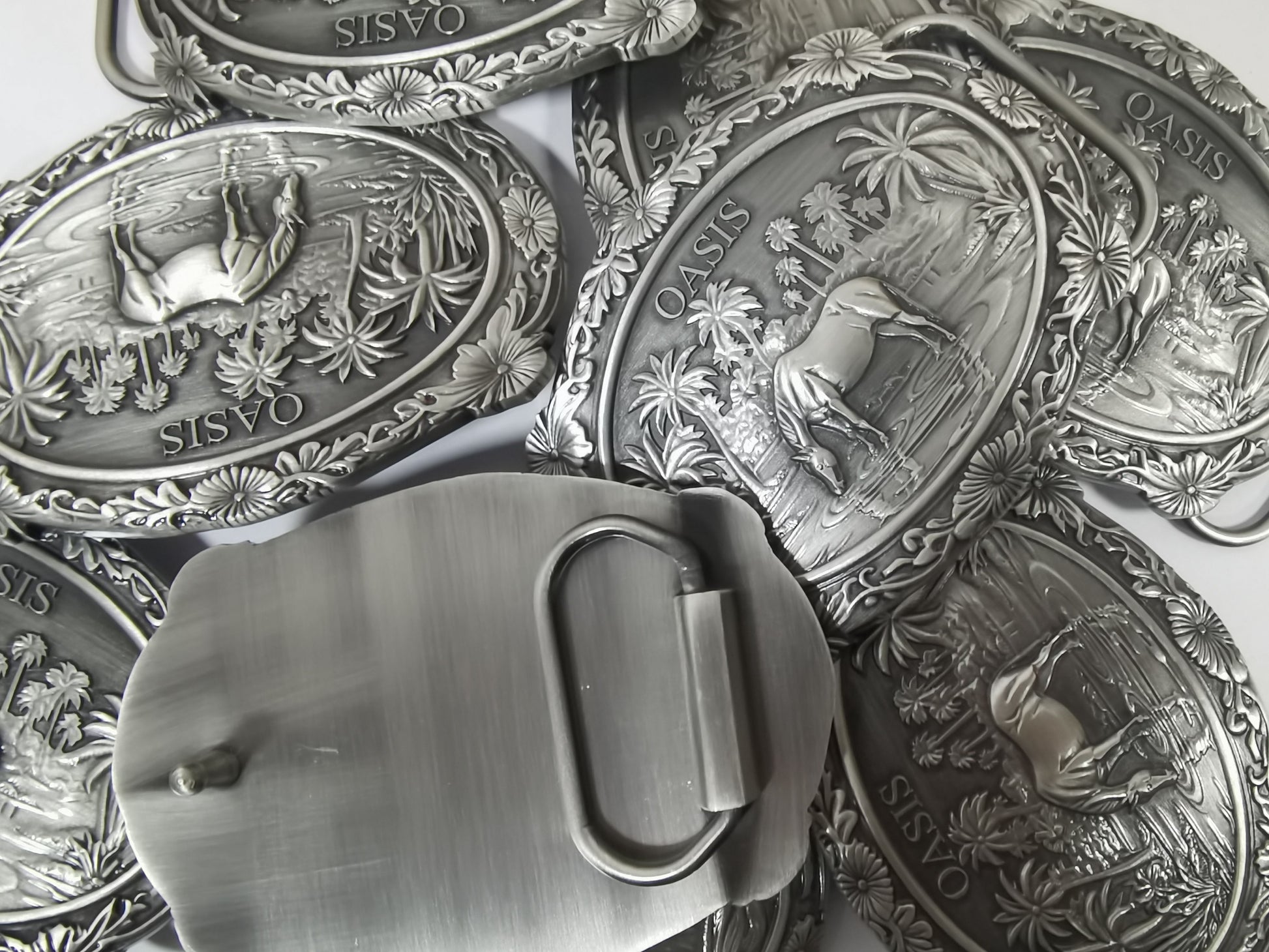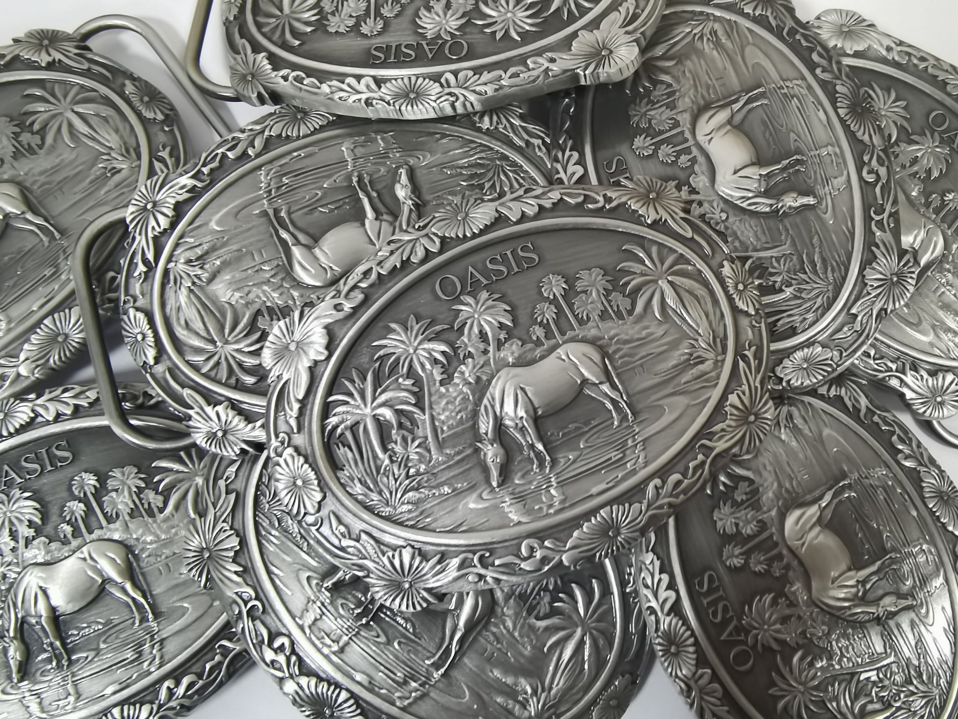 Show off your unique style with our OASIS Belt Buckle! This one-of-a-kind buckle features an original design of a horse having a drink in a palm tree filled oasis.